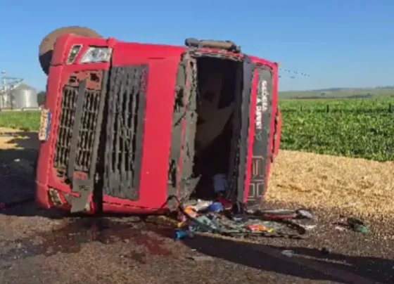 Carreta de soja tomba sobre carro e mata motorista na BR-452, em Santa Helena