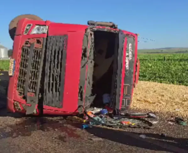 A rodovia está totalmente interditada nos dois sentidos para permitir o trabalho da perícia, a retirada do corpo, o destombamento da carreta e a limpeza completa da pista, que ficou coberta por grãos de soja.