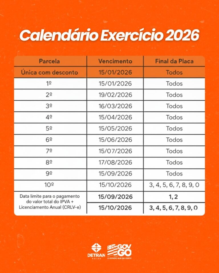Os motoristas goianos devem ficar atentos: o vencimento do IPVA 2026 em Goiás está marcado para o dia 15 de janeiro. A data vale tanto para o pagamento da primeira parcela quanto para a quitação total do imposto com 8% de desconto.